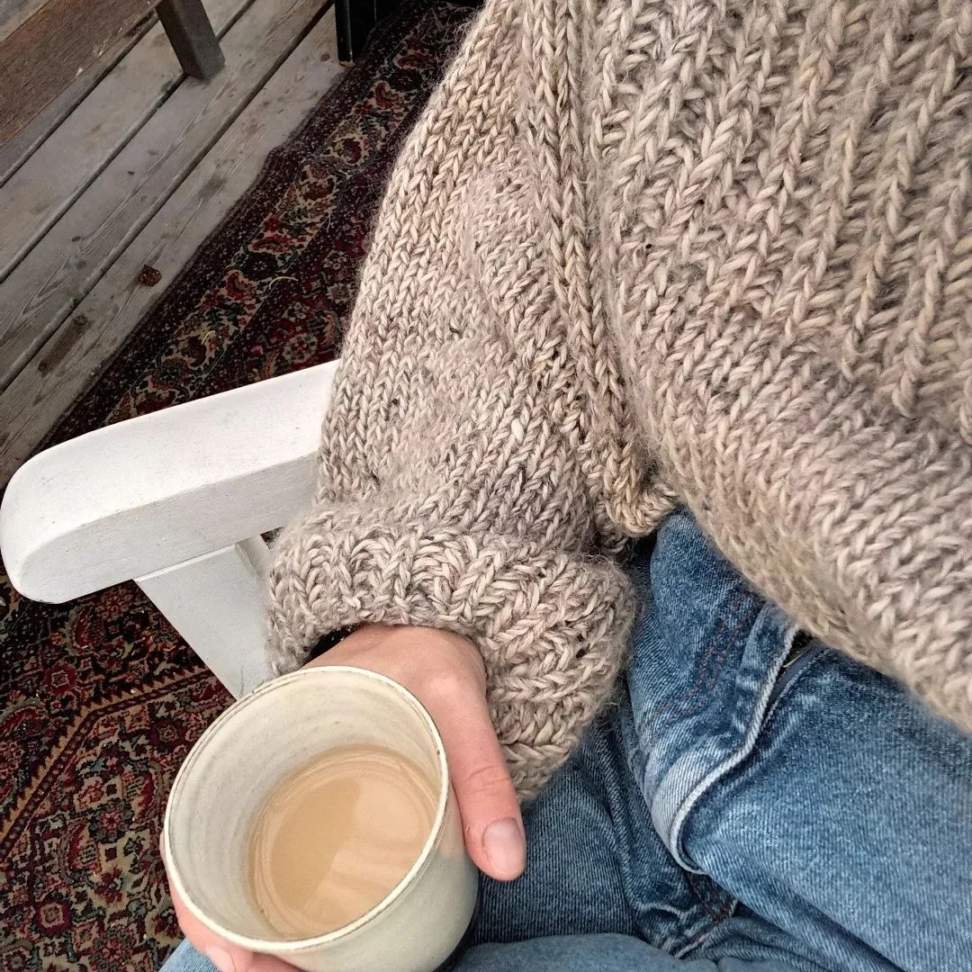An elegant and warm sweater, worked from the top down, where the neck and yoke are worked in brioche stitch in one piece. Increases are made over the shoulders in brioche stitch. The front and back pieces are knit separately, flat, in stockinette stitch. Below the armhole, the back and front pieces are joined to form the body, which is worked in the round on circular needles in stockinette stitch. The hem is worked in brioche stitch. Stitches are picked up for the sleeve, which is worked in the round in stockinette stitch on circular needles and finished with a brioche stitch edge. The sweater has an oversized fit with a positive ease of about 15-30 cm [6-12 inches].